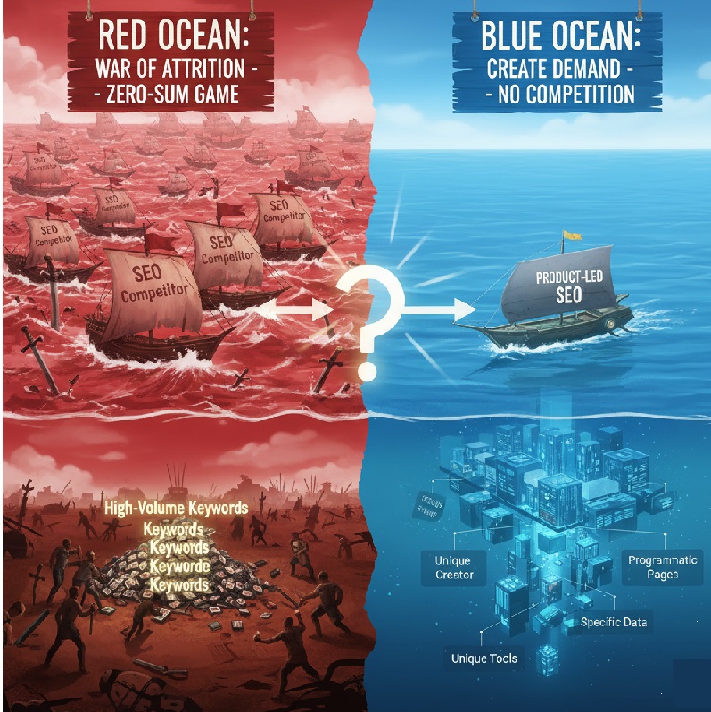 Traditional SEO (Red Ocean) is a “bloody” war of attrition where competitors fight over the same finite set of high-volume keywords.